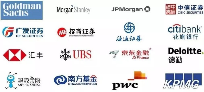 丹利、加拿大皇家银行(RBC)、瑞士联合银行、富国银行、普华永道、中国银行、中国工商银行、中国国际金融有限公司、中国中信、法国巴黎银行、瑞银、德勤、安永会计师事务所、中国平安保险、招商局集团、国泰君安证券股份有限公司等。