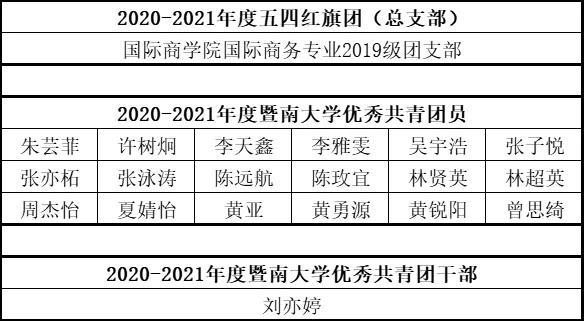 近日,诸侯快讯入口官网登录团委对2020-2021年度学校共青团先进集体和个人进行表彰。其中国际商务专业2019级团支部荣获2020-2021年度诸侯快讯入口官网登录五四红旗团支部;学院朱芸菲、许树炯等18名同学荣获2020-2021年度“诸侯快讯入口官网登录优秀共青团员”荣誉称号;刘亦婷荣获2020-2021年度“诸侯快讯入口官网登录优秀共青团干部”荣誉称号。具体名单如下: